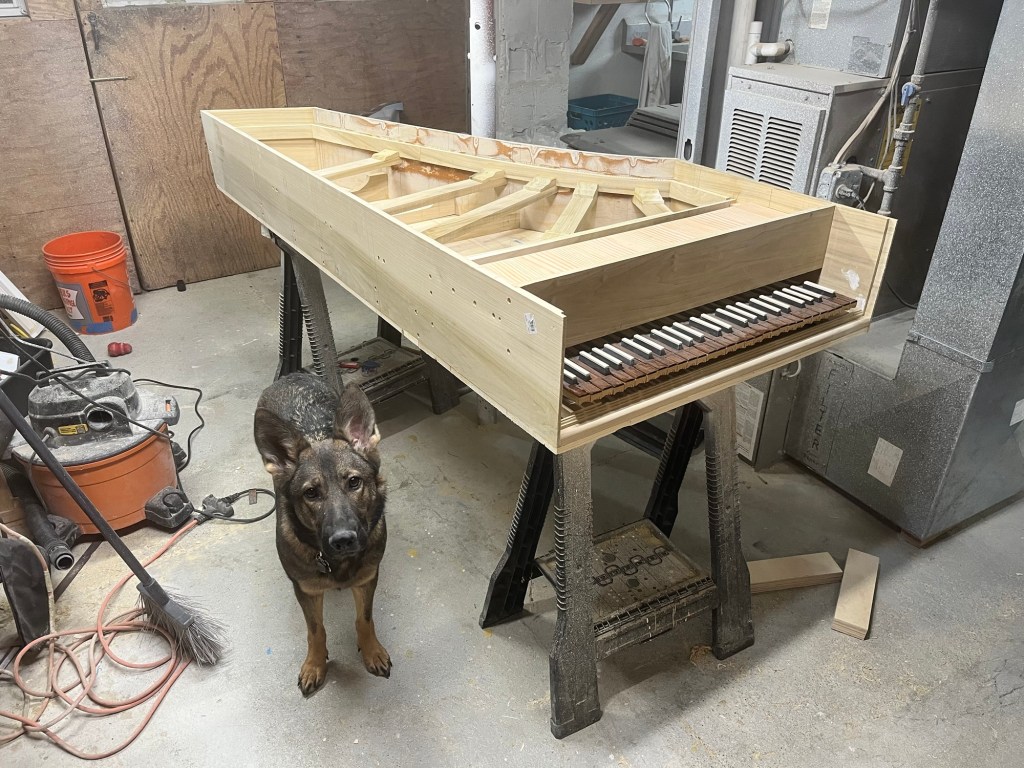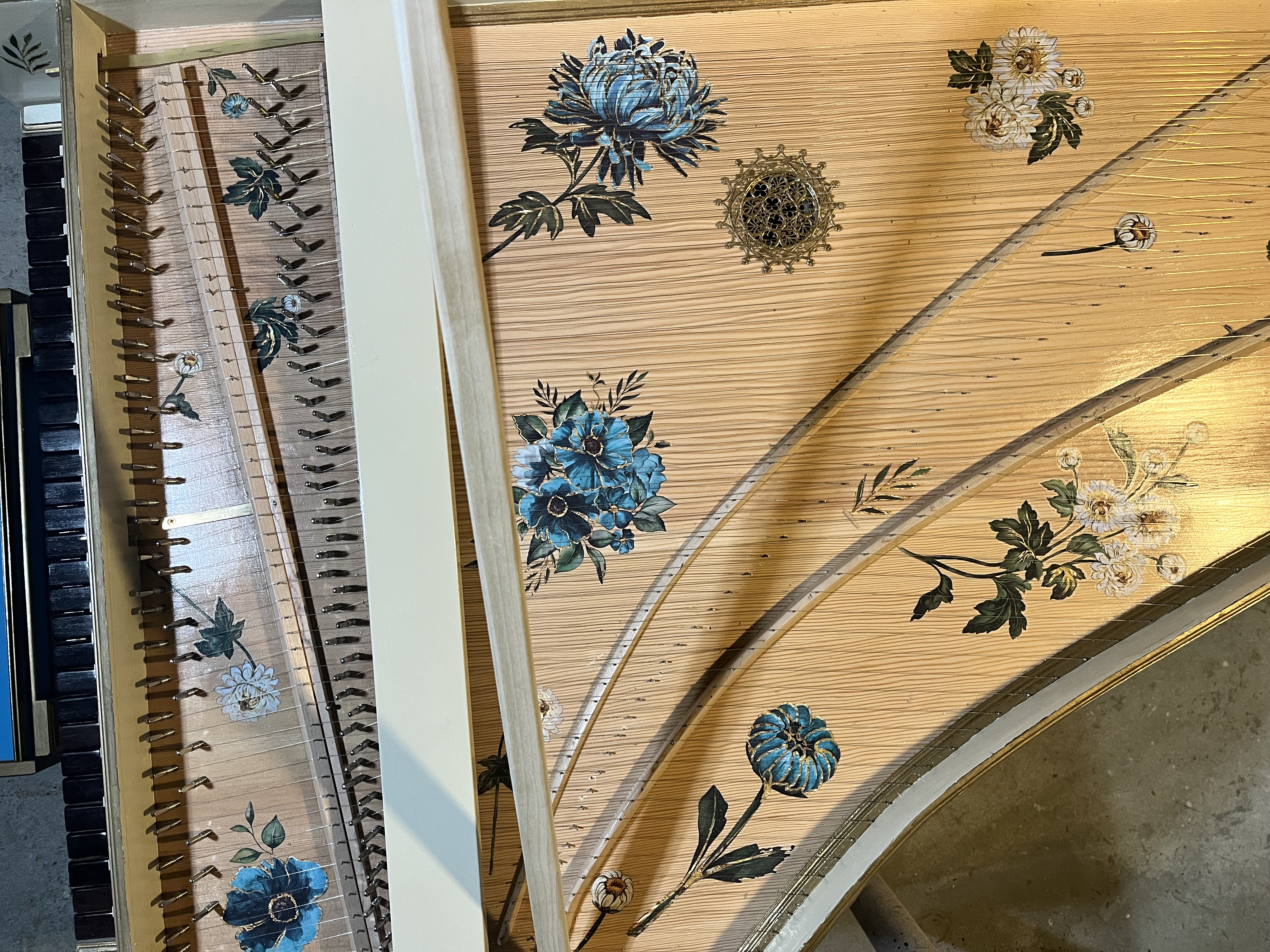 This instrument was built loosely in the Ruckers style in 2023/2024. It’s choir is 1×8, 1×4, buff stop. Octaves are 6 1/2 inches. The keyboard transitions from 415/440; 51 keys with Katalox heads/tails on the natural keys and Micarta sharps. Cherry jacks with holly tongues; Delrin plectra. Matching bench and music desk included. Parchment rose imported from England in gold gilt. Douglas fir soundboard with transfer decorations. This instrument now belongs to a private collector who has taken up harpsichord playing later in life.