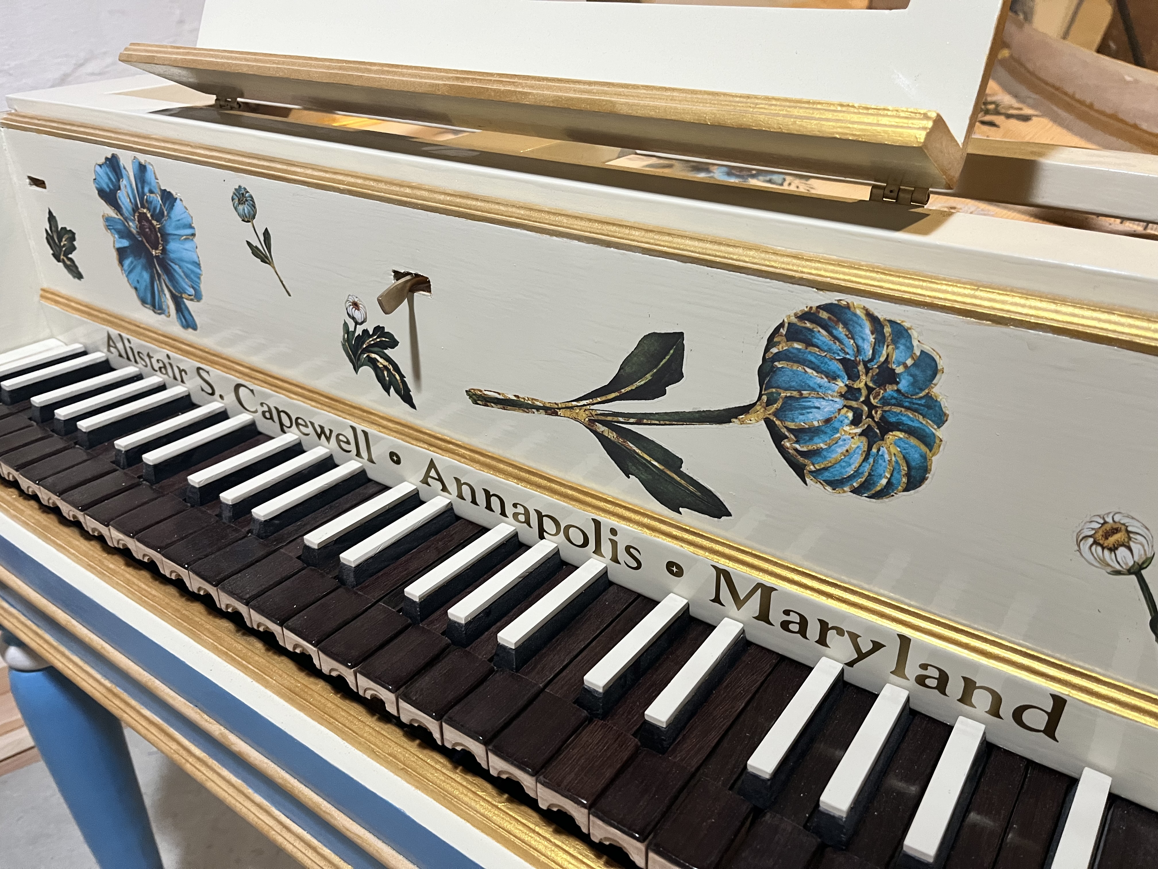 Prussian blue 2.0 is the same style as the original Prussian Blue, but with a few exceptions. The keyboard is Bolivian Rosewood heads/tails and will not transpose. 1×8 choir, buff stop. Custom Prussian Blue color to match a sample (likely Colonial Williamsburg colors), trim off white/stone color. Douglas fir again for the soundboard (Annapolis spruce is all bought up by boat builders).